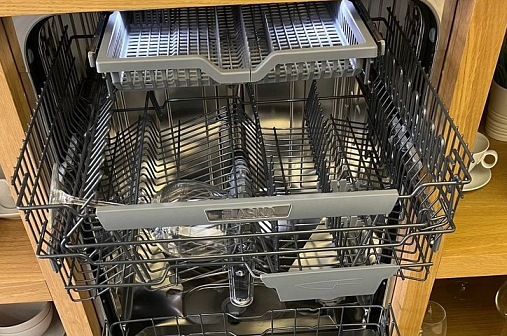 работает хорошо, много держателей, вся моя посуда помещается, но советую посмотреть, у кого не было ранее посудомоечной как лучше делать загрузку. Изначально перекрывала места подачи воды, результат мойки был не оченьНедостатки